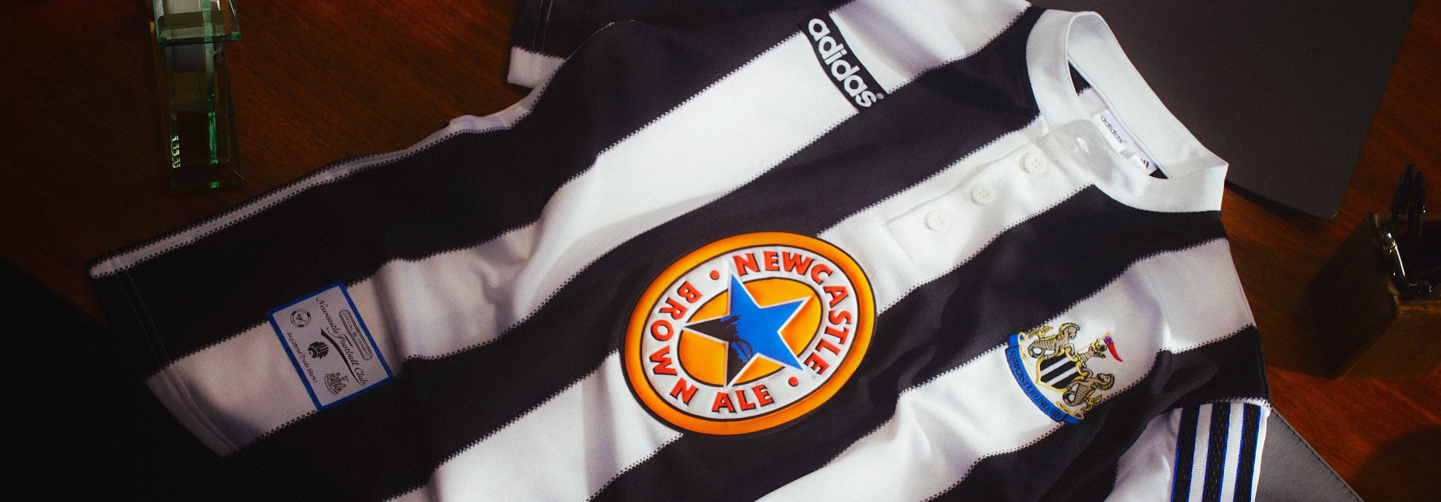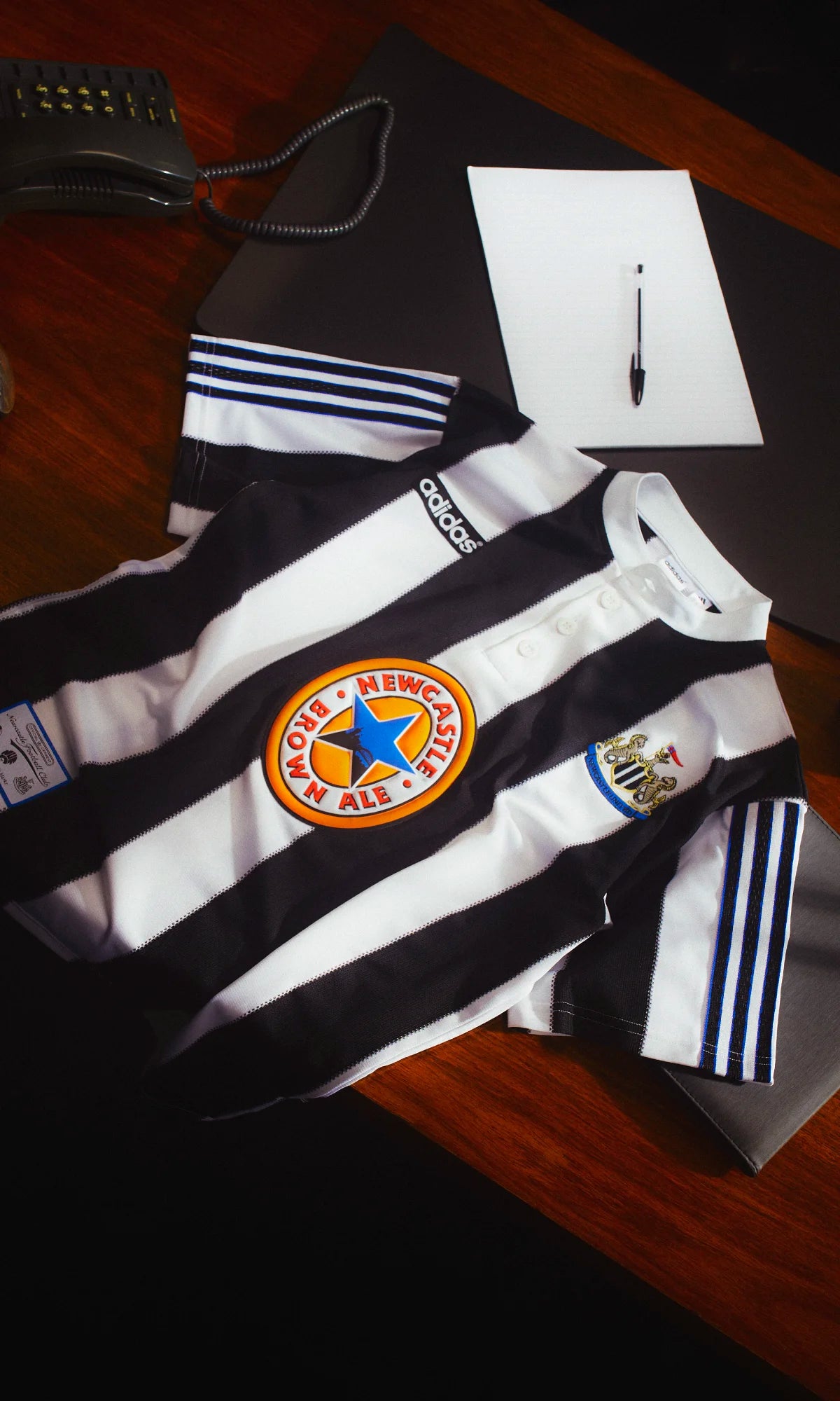 Significant for being our first adidas shirt, the design features a vintage Grandad collar and evenly spaced black and white stripes. Completed with the vibrant Newcastle Brown Ale sponsor, the touch of orange complements our traditional monochromatic look.