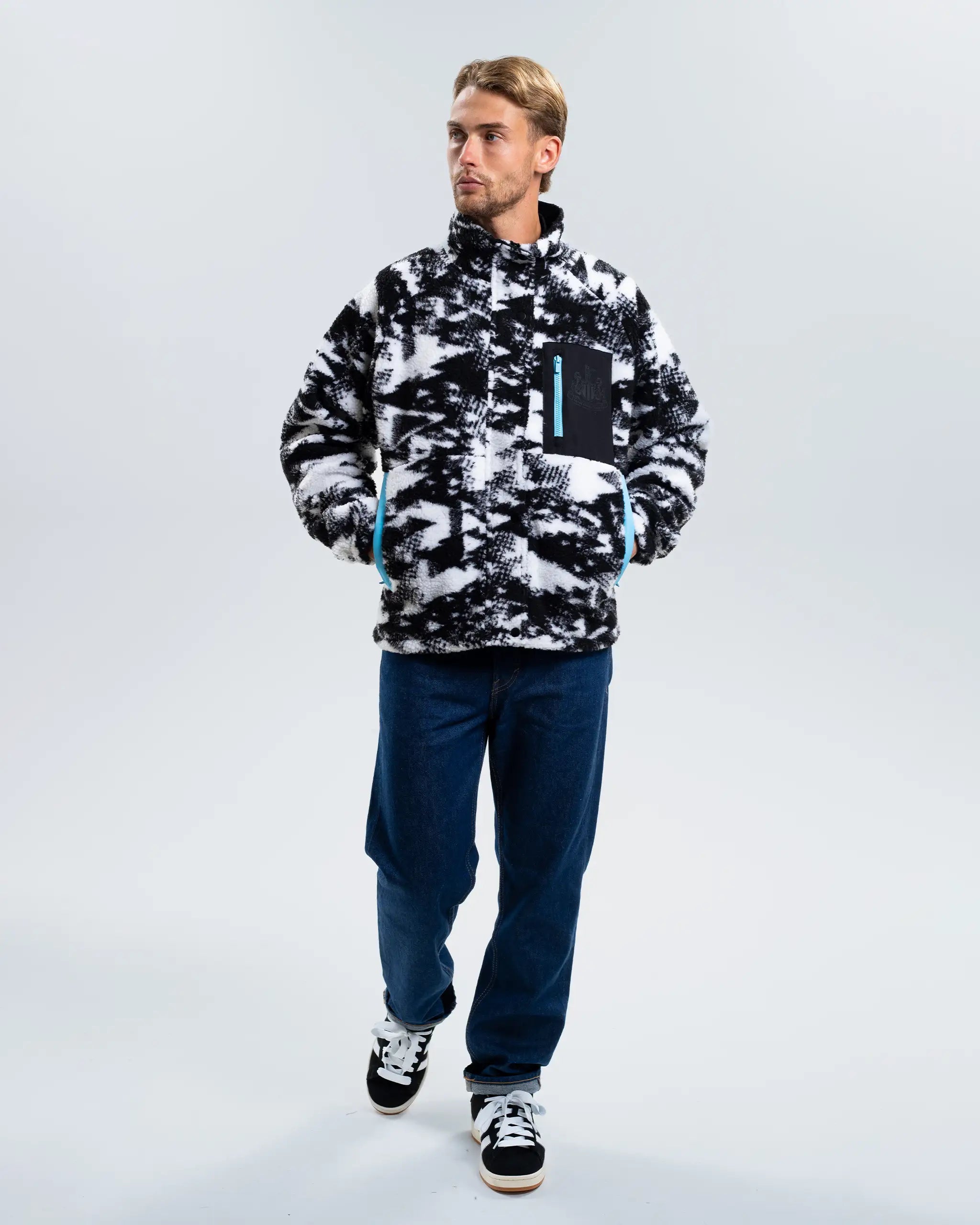 Stay warm while showing your support with the Newcastle United Men’s Printed Borg Teddy Fleece Jacket. Made from soft fleece, it features side and front pockets with blue detailing, and a full-zip front with buttons for extra security. Finished with the NUFC crest on the chest, it’s an easy go-to for cold days - at the game or out and about
