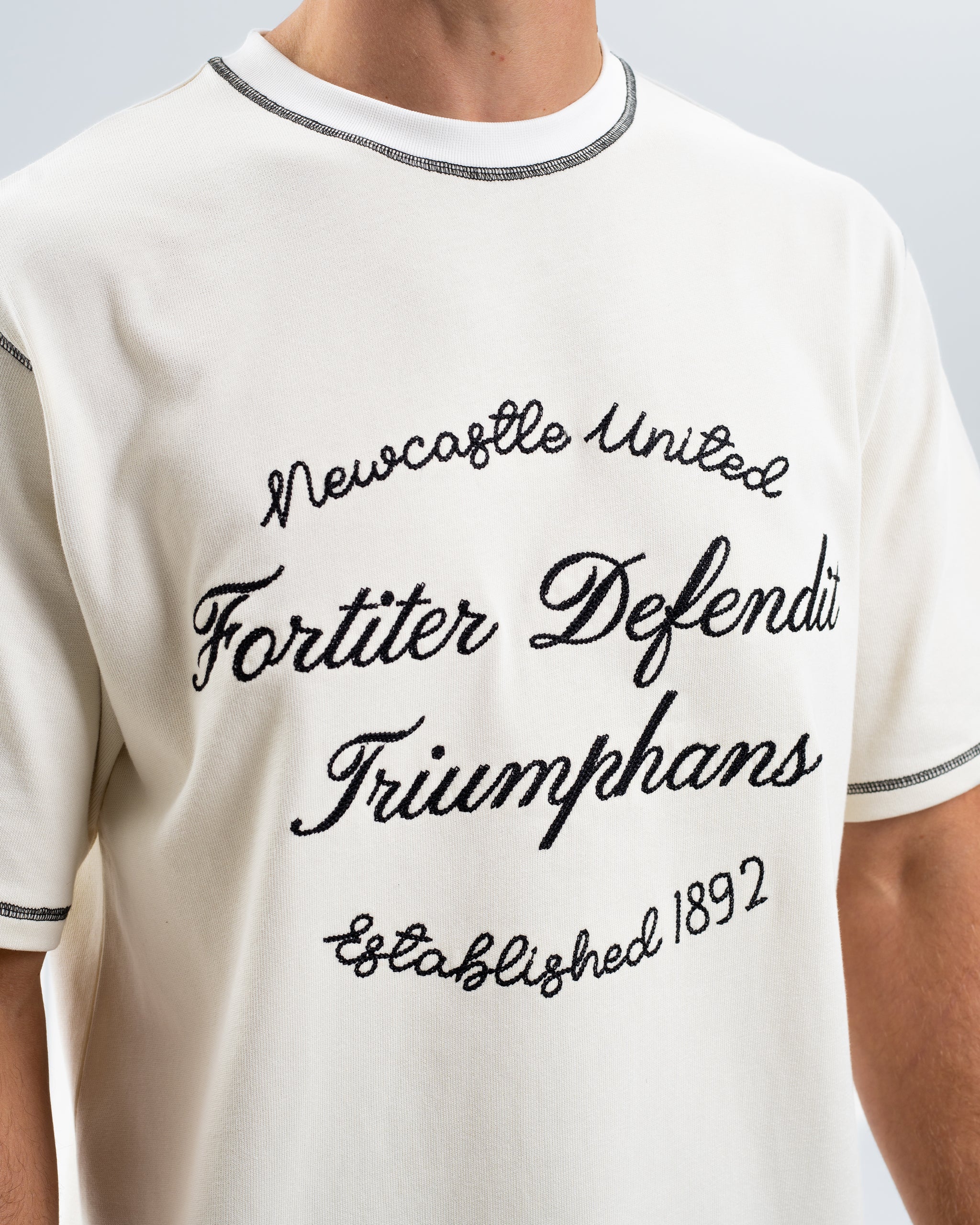 Celebrate Toon pride with a classic twist in the Newcastle United Men’s Relaxed Chainstitch T-Shirt. In a clean cream base with bold black stitching details on the hems, it features an embroidered “Fortiter Defendit Triumphans” on the front – Latin for “Triumphing by brave defence,” a nod to the club’s fighting spirit. With a relaxed fit and subtle yet striking design, it’s perfect for match days, weekends, or any time you want to show your Magpie pride in style.